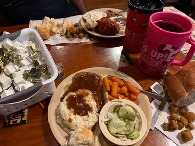 If you’re unfamiliar with Lambert’s, let me introduce you to chaos—but the delicious kind. They are famous for throwing hot yeast rolls at guests, which alone earns them legend status. But it doesn’t stop there. You order an entrée (which comes with two solid sides), and then roaming staff appear offering free bowls of collard greens, fried okra, fried potatoes with onions, tomatoes, black-eyed peas… and molasses and honey butter for those airborne rolls. Drinks arrive in massive insulated “Big Gulp”-style cups that keep things ice-cold and make refills nearly unnecessary.